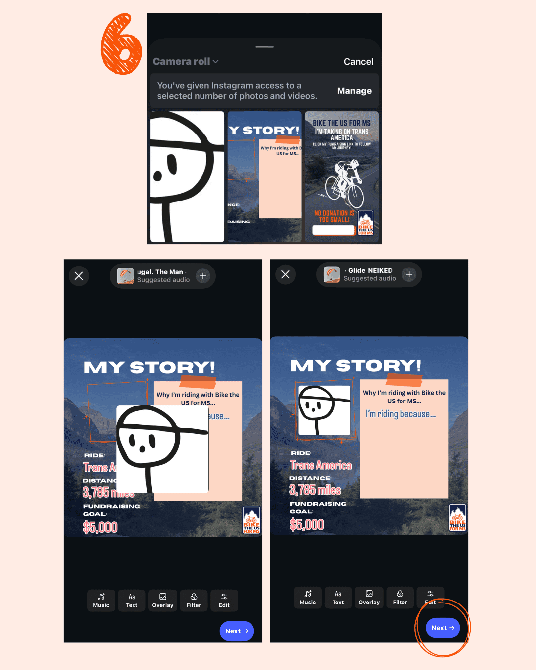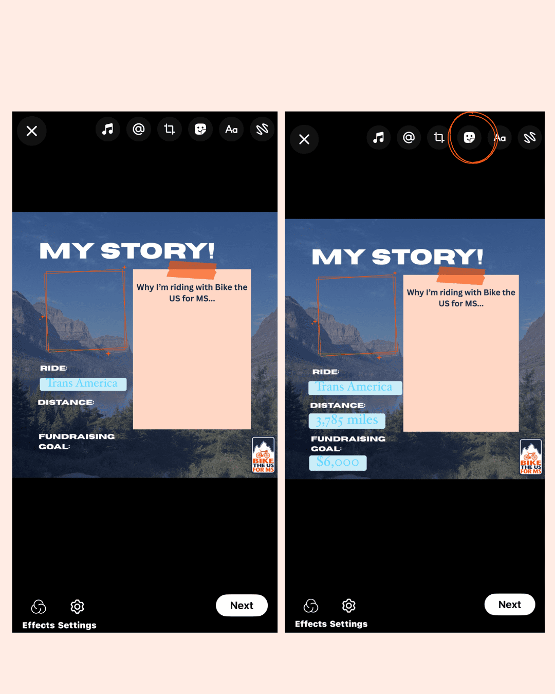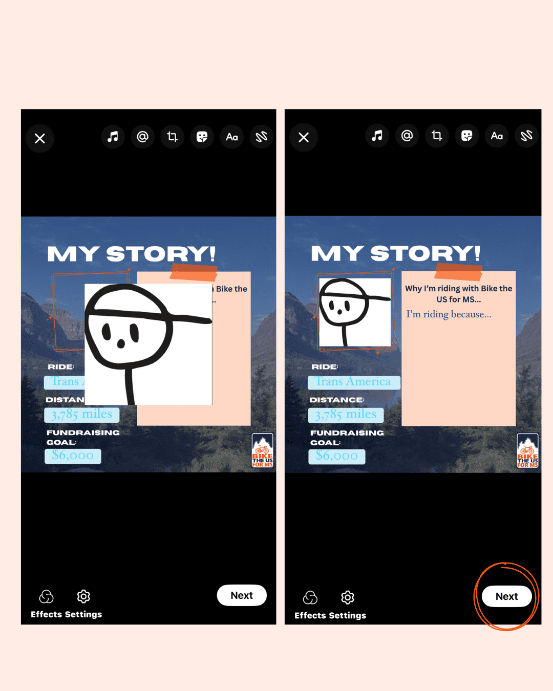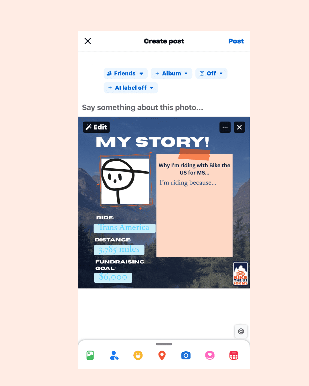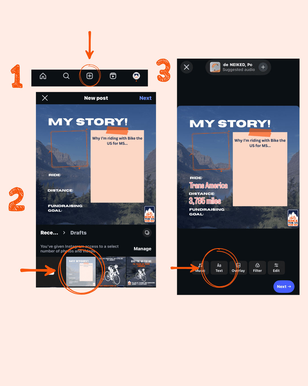 - “Hey! I’ve just signed up to ride with Bike the US for MS to support people living with MS. I’m aiming to raise $___ and would love your first donation to get me started. Any amount helps a lot. Thank you! [your fundraising link]”