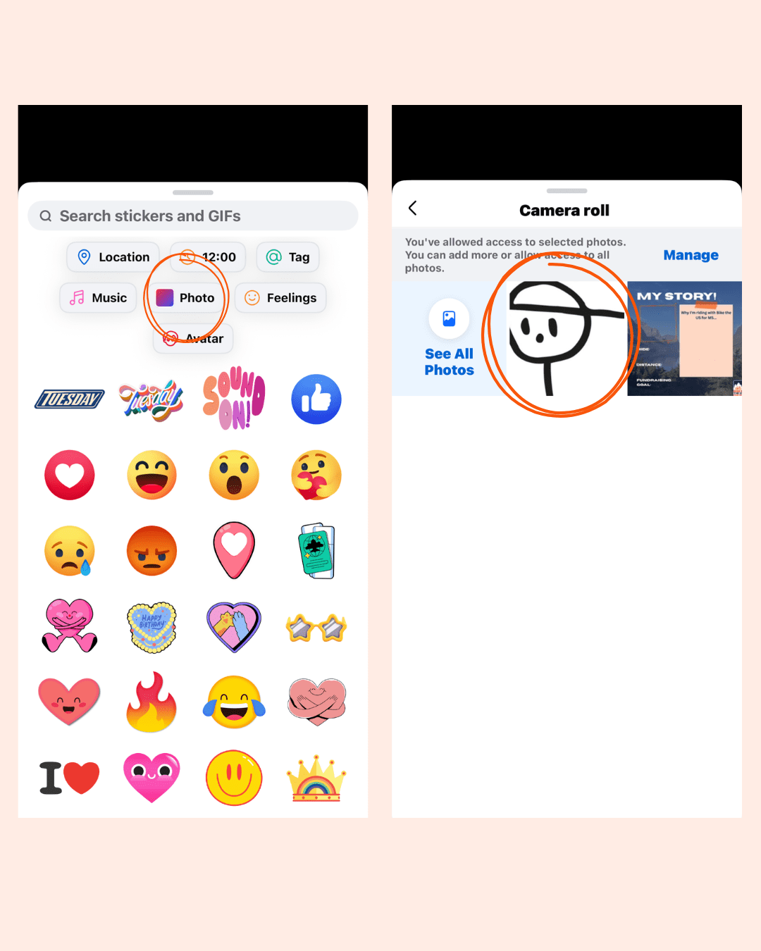 - Tap the square smiley face sticker icon → ‘Photo’ → Select photo from camera roll → Pinch it to resize and move to the photo frame in the top left.