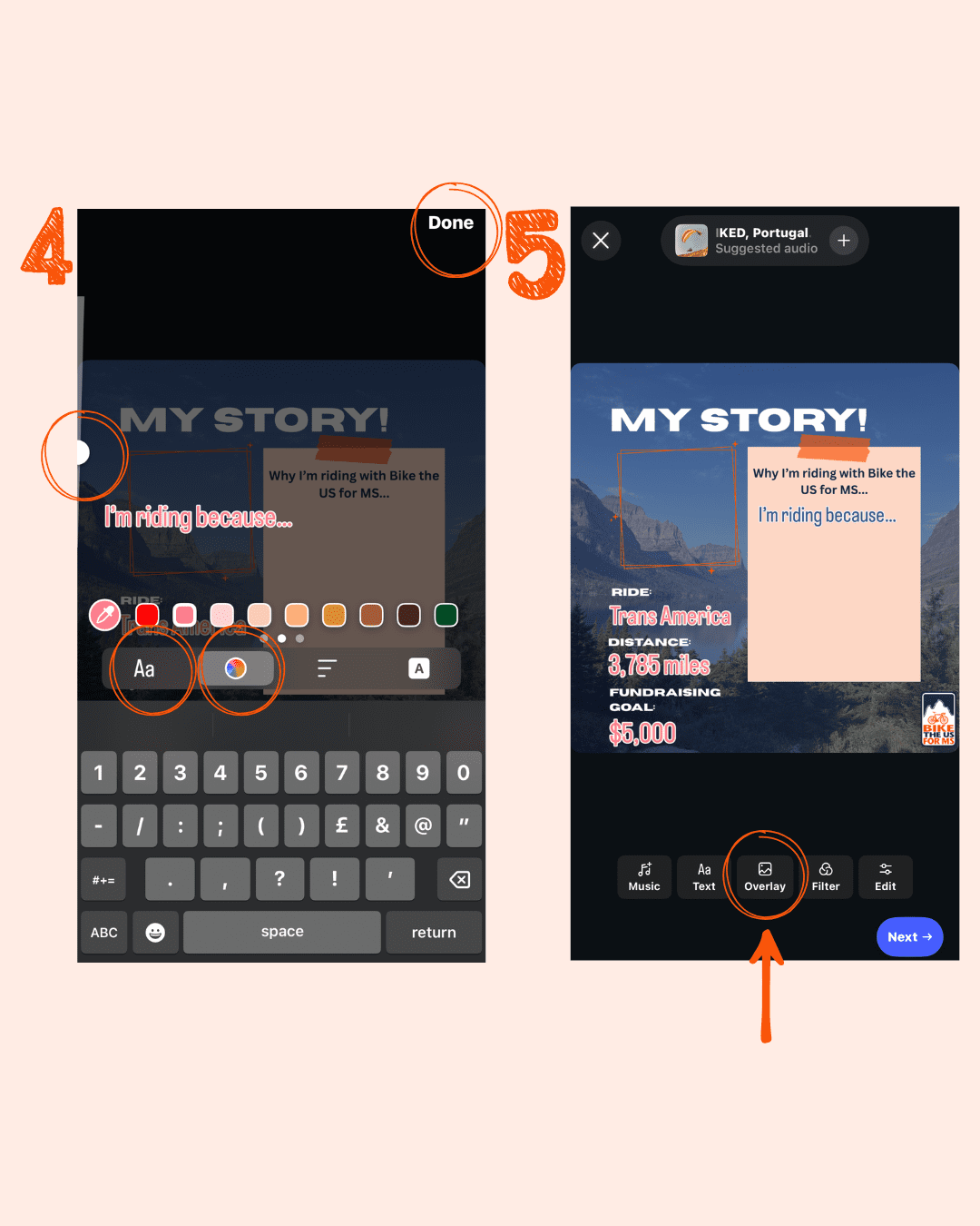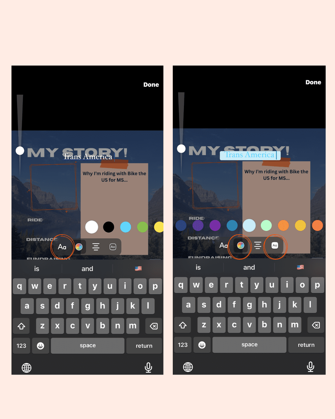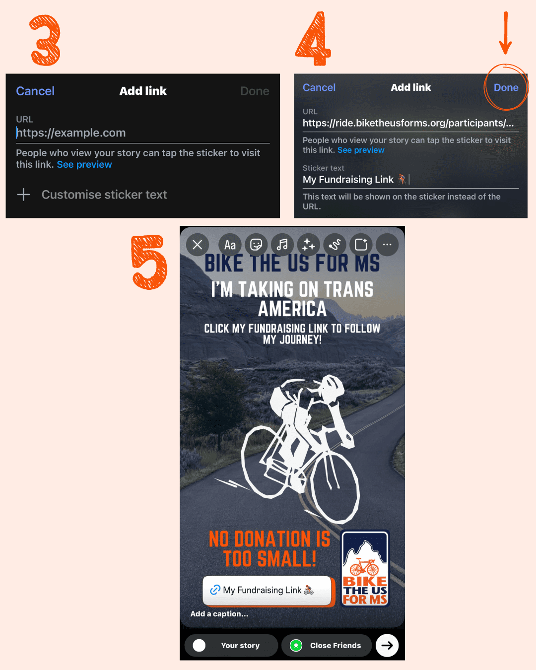 - Fill in your link → Customise sticker text → Type in what you want the sticker to say (e.g. My fundraising link 🚴♀️) → Click ‘Done’