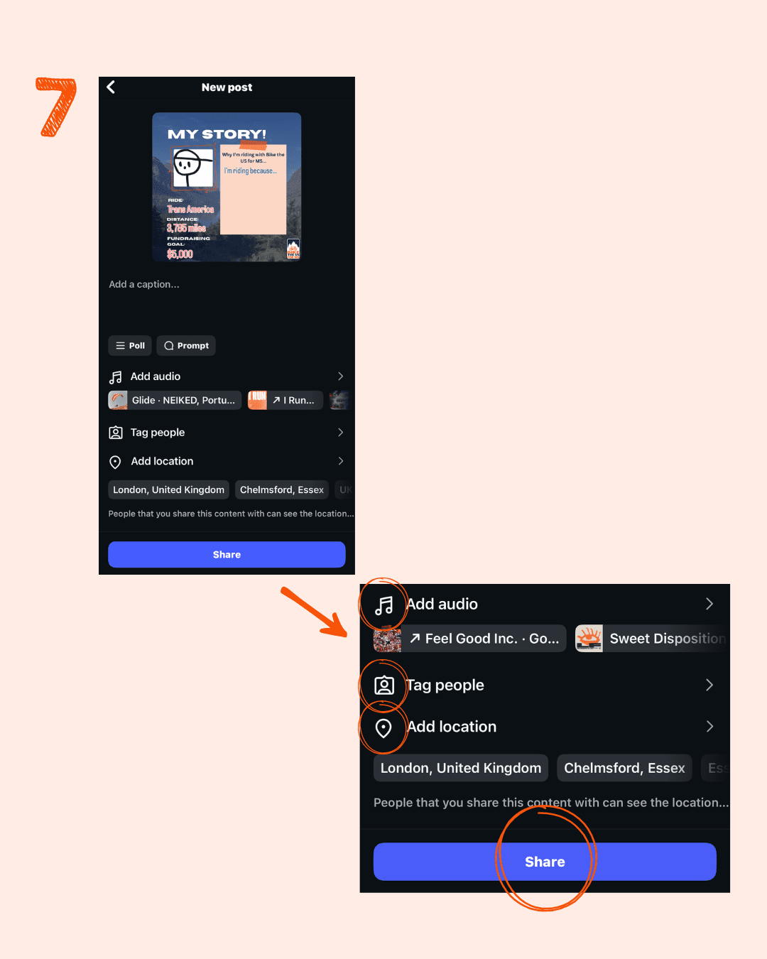 - Here you can add a caption and audio to your post.